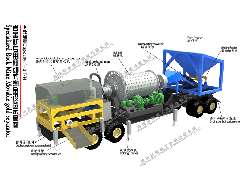此款为移动球磨机选矿设备,为青州冠诚重工机械有限公司独立研发,球磨机是物料被破碎之后,再进行粉碎的关键设备。